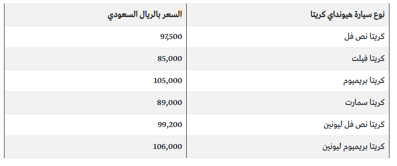 تحتوي على وسائد هوائية للسائق والراكب الأمامي. مزودة بوسائد هوائية جانبية أمامية. مزودة بنظام تحكم بالثبات. تحتوي على كمبيوتر يوضح المسافة والوقود ومتوسط السرعة. مزودة بنظام مساعد الفرامل. تمتلك نظام قياس ضغط الهواء في الإطارات. مزودة بنظام التحكم في الالتصاق الناشئ من التسارع. لديها قوة العزم 242 نيوتن/ متر. يوجد بها فرامل مانعة للانغلاق. تمتلك سعة المحرك 1.6 لتر. يمكن الحصول على السيارة بعدة ألوان، ومنها: (الفضي – الرمادي – الأبيض – الأحمر – الأسود). يمكن دخول السيارة بدون وجود مفتاح. بالإمكان التحكم في السرعة على المقود. يمكن تحكم الصوت على عجلة القيادة. سعر سيارة هيونداي كريتا إن سيارة هيونداي كريتا يوجد لها العديد من الأنواع والإصدارات، والجدير بالذكر أن أسعارها متفاوتة، ومن خلال الجدول التالي نوضح لكم تفاصيل تلك الأسعار:
