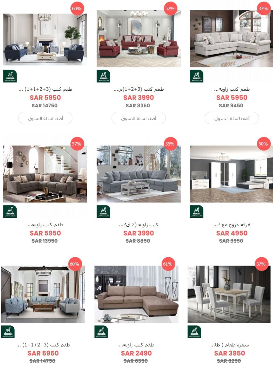 وأخيرًا، يقدم متجر مفروشات العمر خصومات تصل إلى 50% على مجموعة مختارة من أطقم الجلوس والكنب وطاولات الطعام.