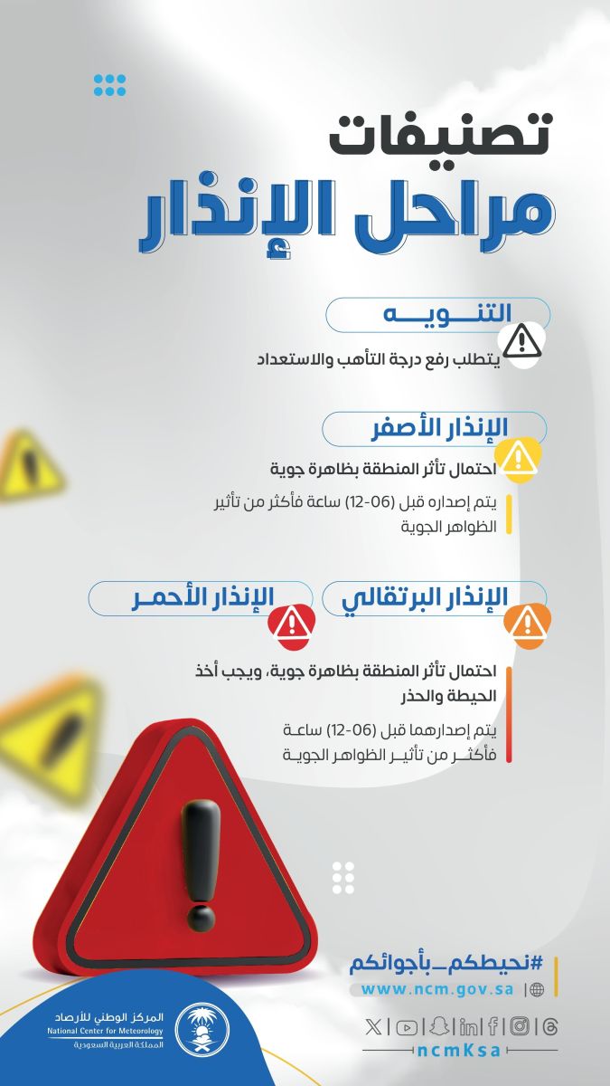 يكشف المركز الوطني للأرصاد عن درجات الخطورة والأمان المترتبة على تصنيفات مراحل الإنذار المعتمدة.