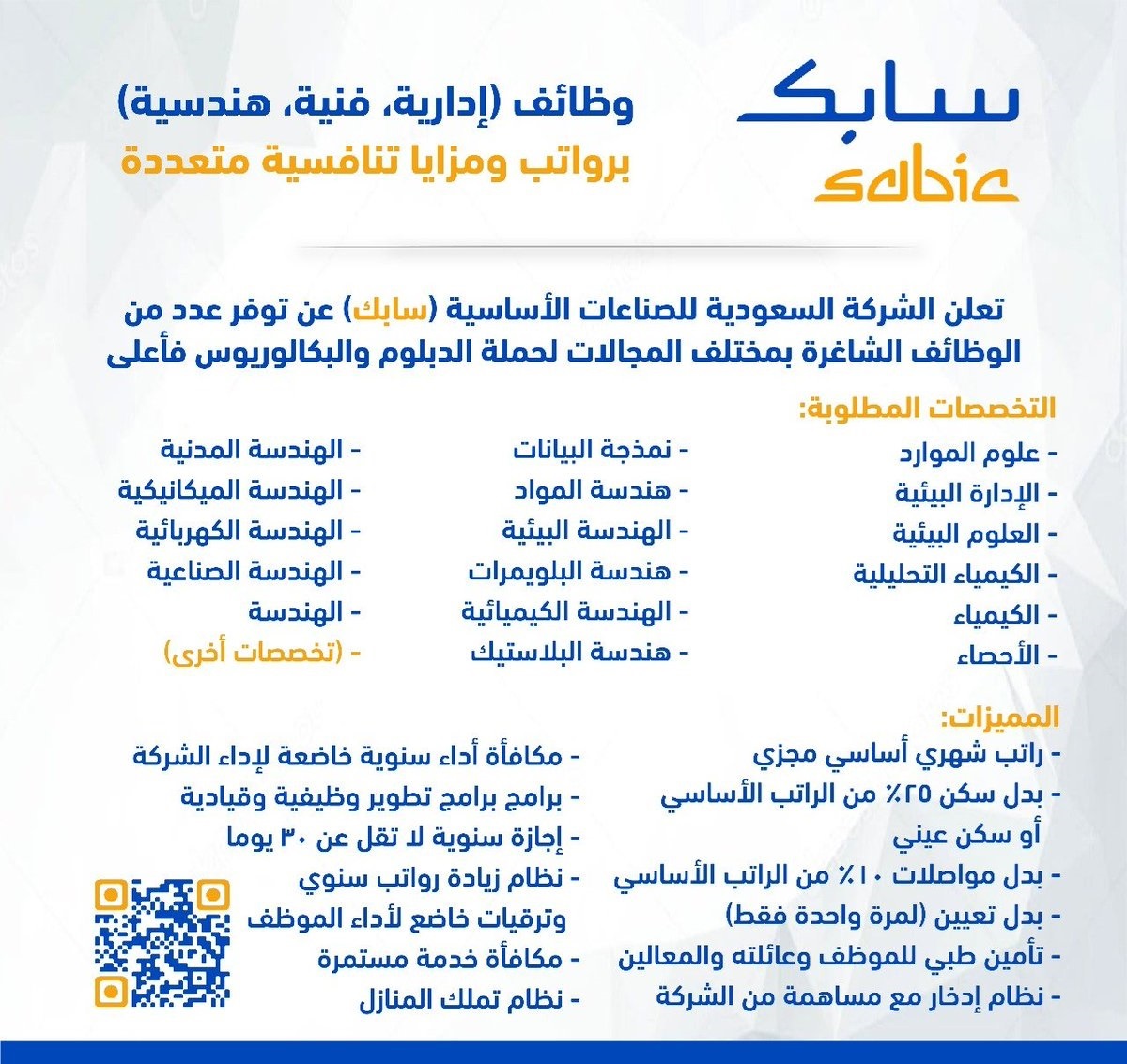 أعلنت "سابك"، الشركة الرائدة في مجال الصناعات الأساسية بالسعودية، عن فتح باب التقديم لشغل عدة وظائف متنوعة موجهة للأشخاص الحاصلين على الدبلوم والبكالوريوس أو مؤهلات أعلى.