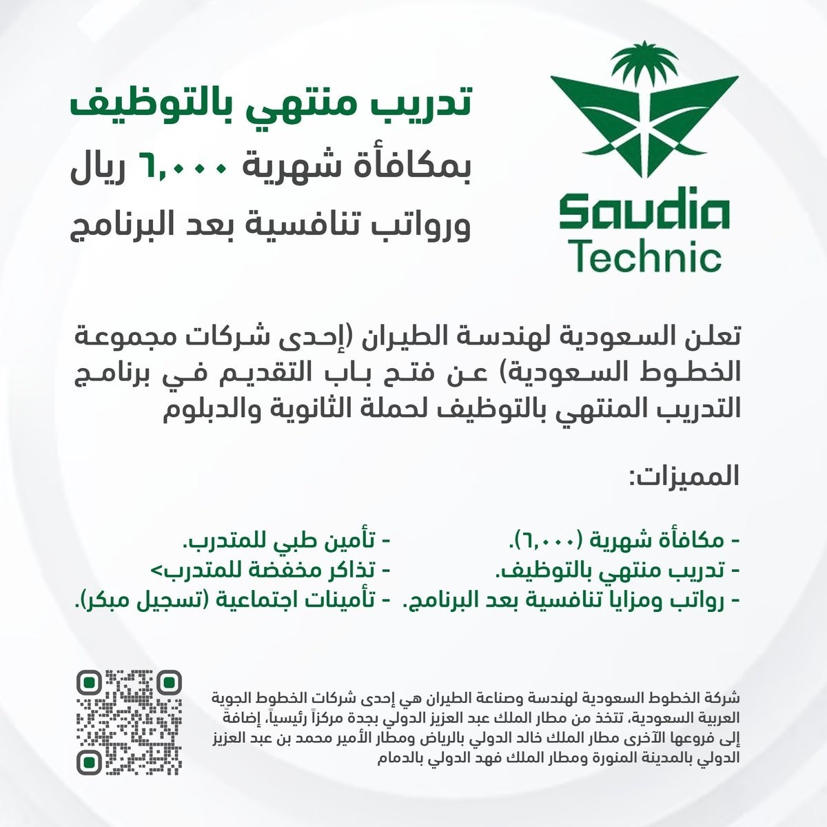 مجموعة الخطوط السعودية أعلنت عن فتح باب التقديم في برنامج "فني صيانة الطائرات"، الذي ينتهي بالتوظيف لحملة الثانوية والدبلوم.