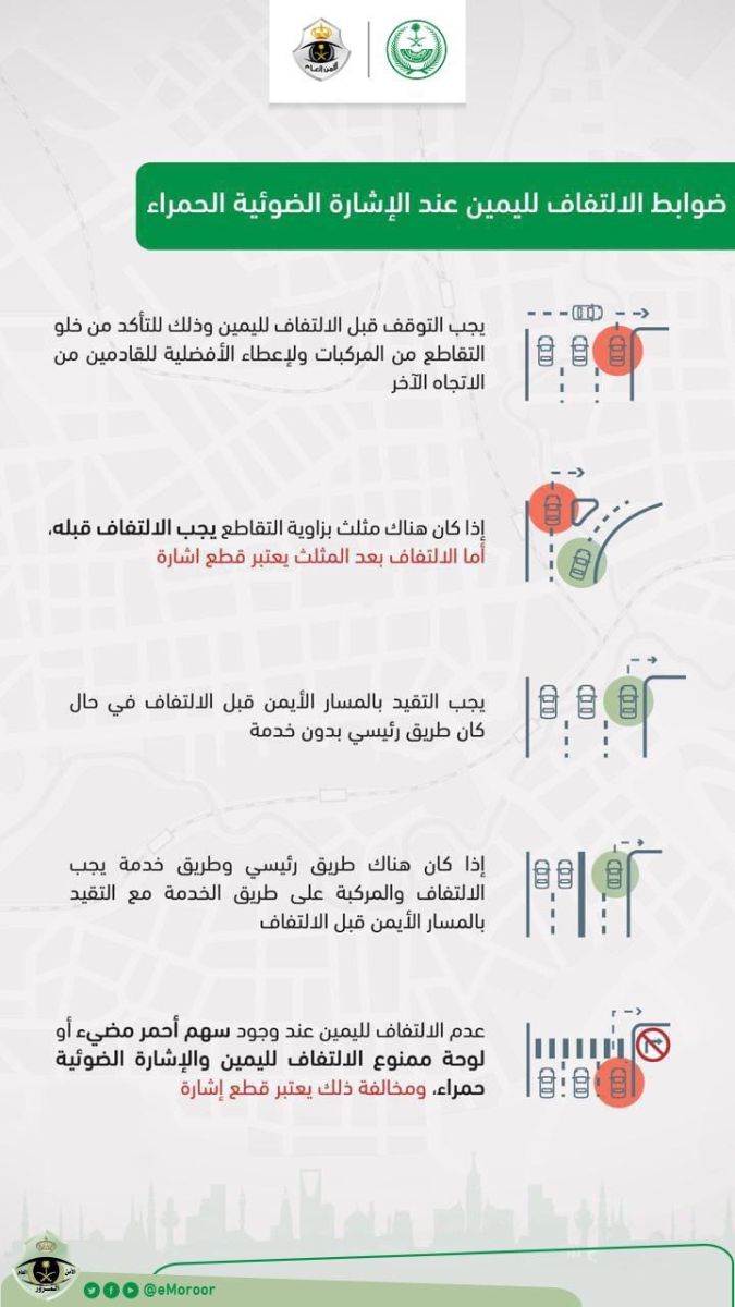 في استجابة لاستفسار أحد المواطنين عبر الحساب الرسمي للمرور على منصة إكس حول إمكانية الالتفاف إلى اليمين عندما تكون الإشارة الضوئية حمراء والمسار ملتزم به، والتوقف لأكثر من عشرين ثانية، أوضح المرور الضوابط الخمسة الواجب مراعاتها:
