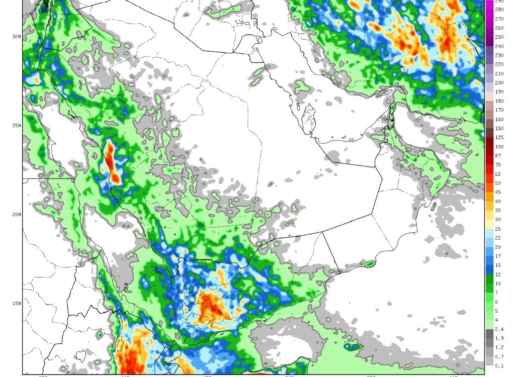 تقرير المركز الوطني للأرصاد يشير إلى استمرار هطول أمطار رعدية متوسطة إلى غزيرة مع جريان السيول، وذلك على أجزاء من مناطق مكة المكرمة، الباحة، عسير، جازان، نجران، تمتد إلى الأجزاء الجنوبية الغربية من منطقة الرياض. كما يُتوقع تأثر الرؤية بالعوالق الترابية في أجزاء من مناطق الحدود الشمالية، الجوف، وتبوك.