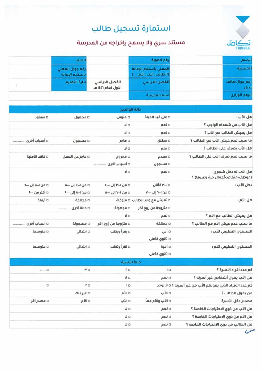 أصدرت مؤسسة تكافل الخيرية استمارة تسجيل خاصة بالطلاب لبرنامج الدعم، مشددة على أنها وثيقة سرية لا يسمح بإخراجها خارج المدرسة.
