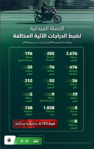 في إطار جهود المملكة المستمرة لتعزيز السلامة المرورية والحد من المخالفات التي تهدد حياة مستخدمي الطرق، نفذت إدارات المرور في مختلف مناطق المملكة حملة ميدانية شاملة لضبط الدراجات الآلية المخالفة خلال الفترة من الأحد 30 نوفمبر حتى السبت 6 ديسمبر 2025م.