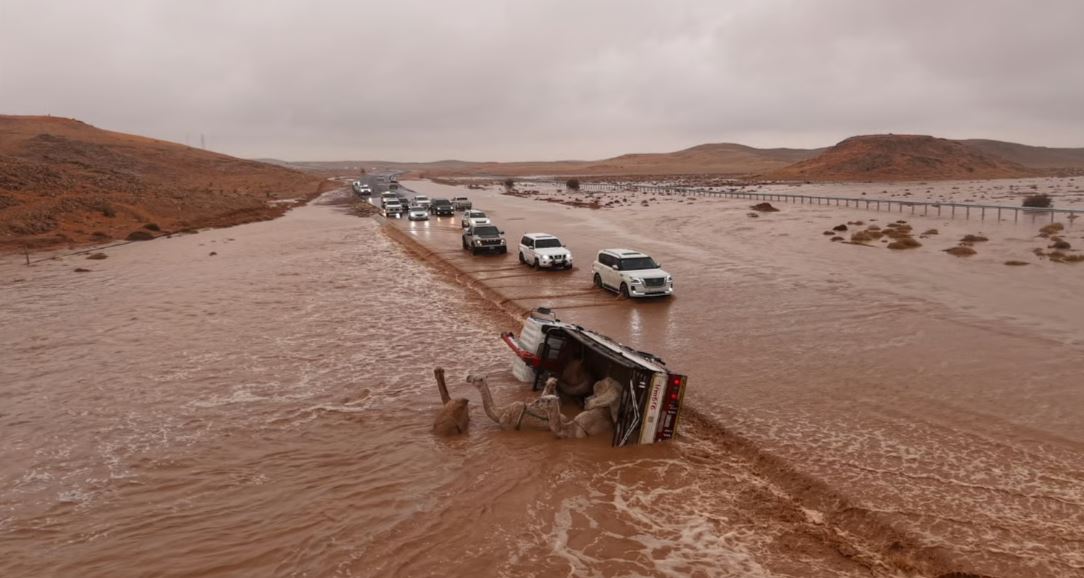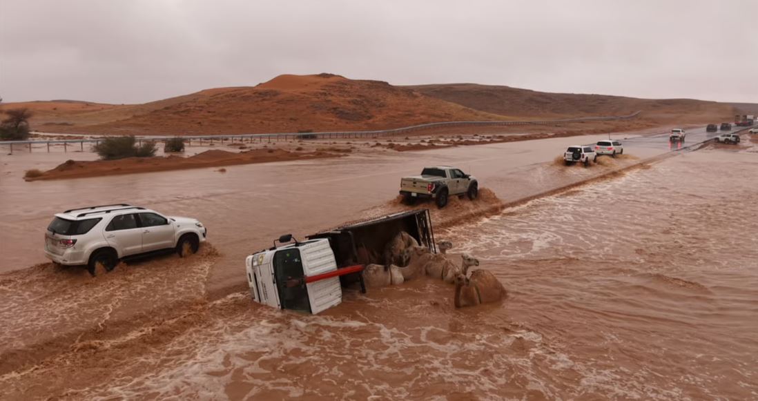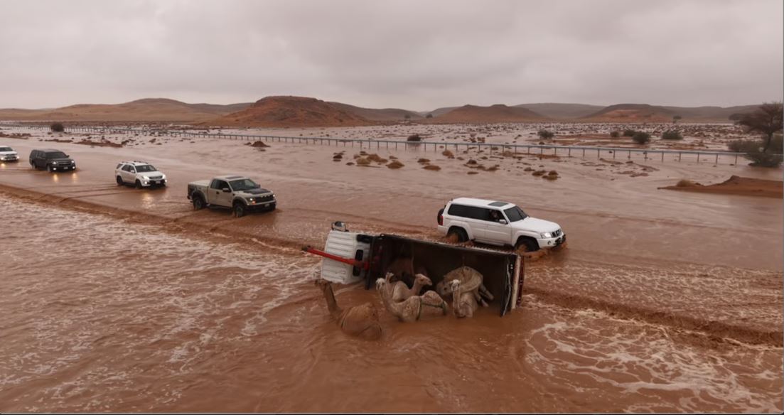 انقلاب شاحنة محملة بالإبل بسبب السيول في السعودية