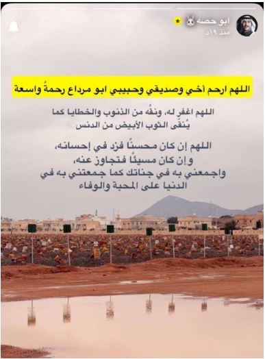 أرفق أبو حصة الصورة بدعاء مؤثر عبّر فيه عن حزنه العميق على فراق صديقه، حيث قال: اللهم ارحم أخي وصديقي وحبيبي أبو مرداع رحمة واسعة، اللهم اغفر له، ونقه من الذنوب والخطايا كما ينقى الثوب الأبيض من الدنس.