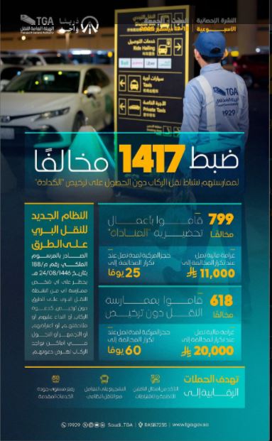 أما في حالات ممارسة النقل غير المرخص، فقد تصل الغرامة إلى عشرين ألف ريال، إضافة إلى حجز المركبة لمدة قد تمتد إلى ستين يوم.