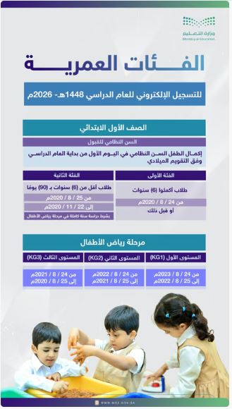 حددت وزارة التعليم الفئات العمرية الخاصة بمرحلة الصف الأول الابتدائي ومرحلة رياض الأطفال للعام الدراسي 1448هـ – 2026م، وذلك وفقا للسن النظامي للقبول بالتقويم الميلادي.