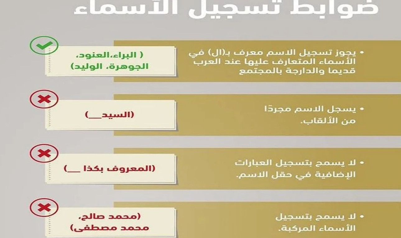 الألقاب: ينبغي خلو الاسم من الألقاب، مثال على ذلك: فاطمة الزهراء أو منة الله أو عبد النبي؛ فتلك الأسماء لم يُعترف بها في هيئة الأحوال المدنية.