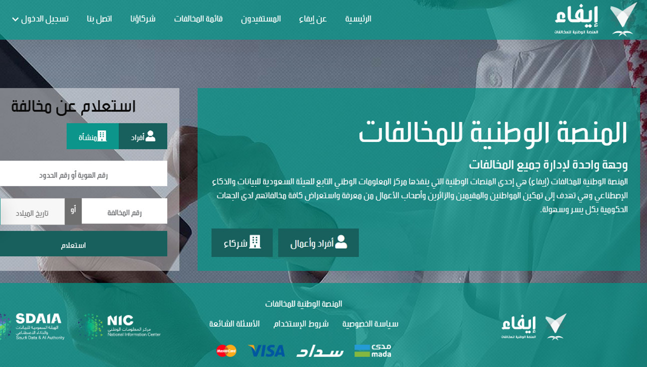 يتم التوجه إلى منصة إيفاء الإلكترونية في المملكة العربية السعودية من خلال هذا الرابط مباشرة لتسجيل دخولك في حساب المستفيد والاستعلام عن المخالفات وللحصول على الكثير من الخيارات التي لا تتيحها المنصة للزوار.