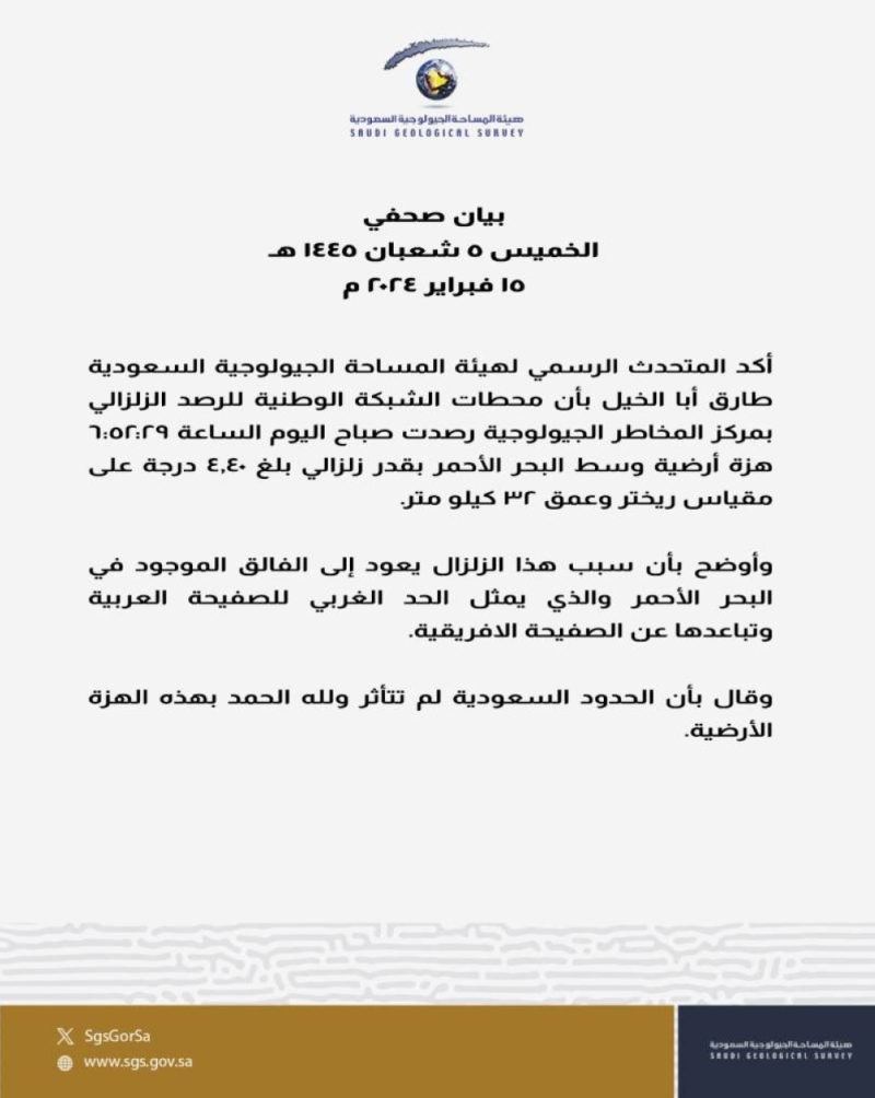أكد طارق أبا الخيل، المتحدث الرسمي لهيئة المساحة الجيولوجية السعودية، أن محطات الشبكة الوطنية للرصد الزلزالي بمركز المخاطر الجيولوجية رصدت في صباح اليوم الساعة 6:52:29 هزة أرضية في وسط البحر الأحمر، بلغت قوتها 4.40 درجات على مقياس ريختر، وكانت على عمق 32 كيلومترًا.