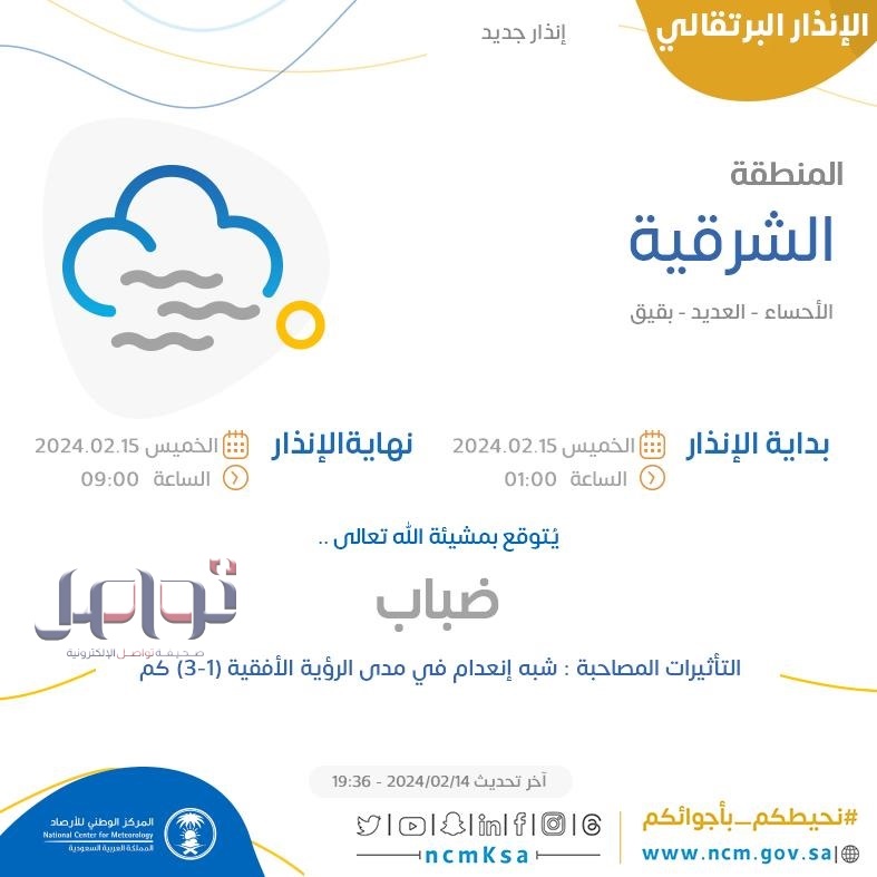 من المتوقع أن تستمر الحالة الجوية في المناطق الشرقية ومكة وعسير حتى الساعة 9 صباحًا من يوم غد الخميس.