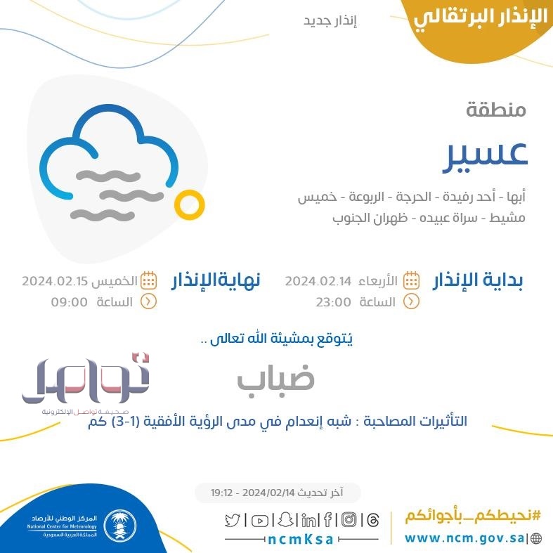بينما ستستمر في منطقة الباحة حتى الساعة 10 صباحًا من يوم غد الخميس.