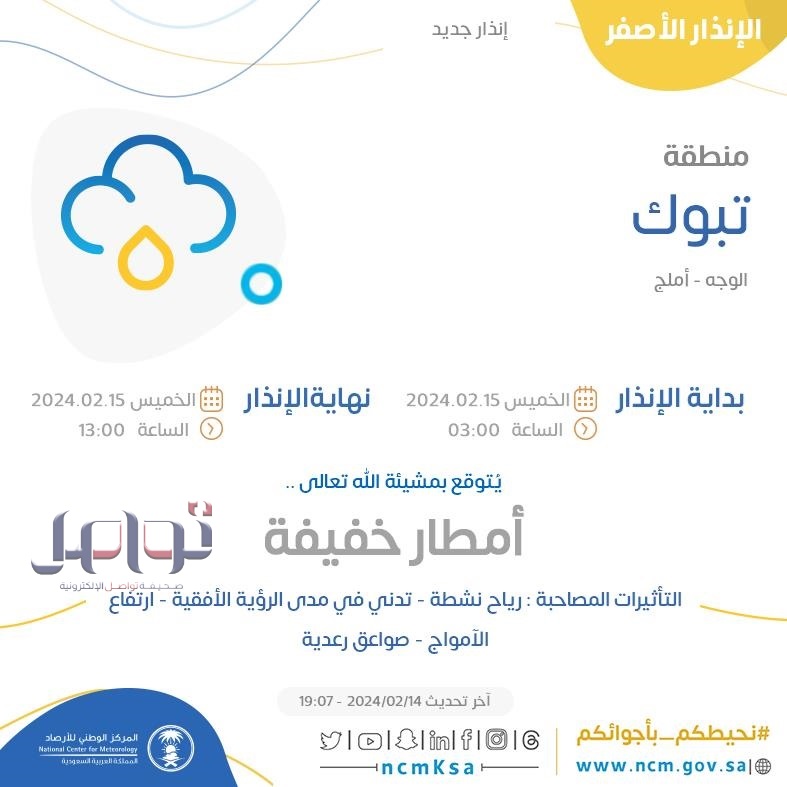 تستمر الحالة الجوية في منطقة تبوك حتى الساعة 1 ظهرًا من يوم غد الخميس بمشيئة الله.