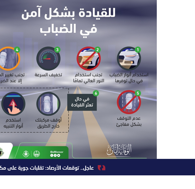 وفيما يتعلق بالسلامة على الطرق في ظروف الضباب، فقد نصحت الإدارة العامة للمرور بعدة نصائح منها استخدام أنوار الضباب إذا كانت متاحة، تجنب استخدام النور العالي، تخفيف السرعة، تجنب تغيير المسار إلا عند الضرورة، عدم التوقف بشكل مفاجئ، وفي حالة عدم القدرة على الرؤية بوضوح ينصح بالتوقف بشكل آمن خارج الطريق.