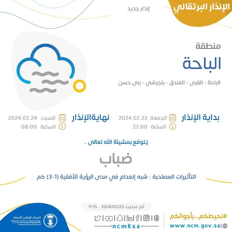 أطلق المركز الوطني للأرصاد تحذير يتعلق بتوقعات بتشكل ضباب مصحوب بأمطار خفيفة في عدة مناطق من المملكة، حتى الساعة التاسعة صباحًا.