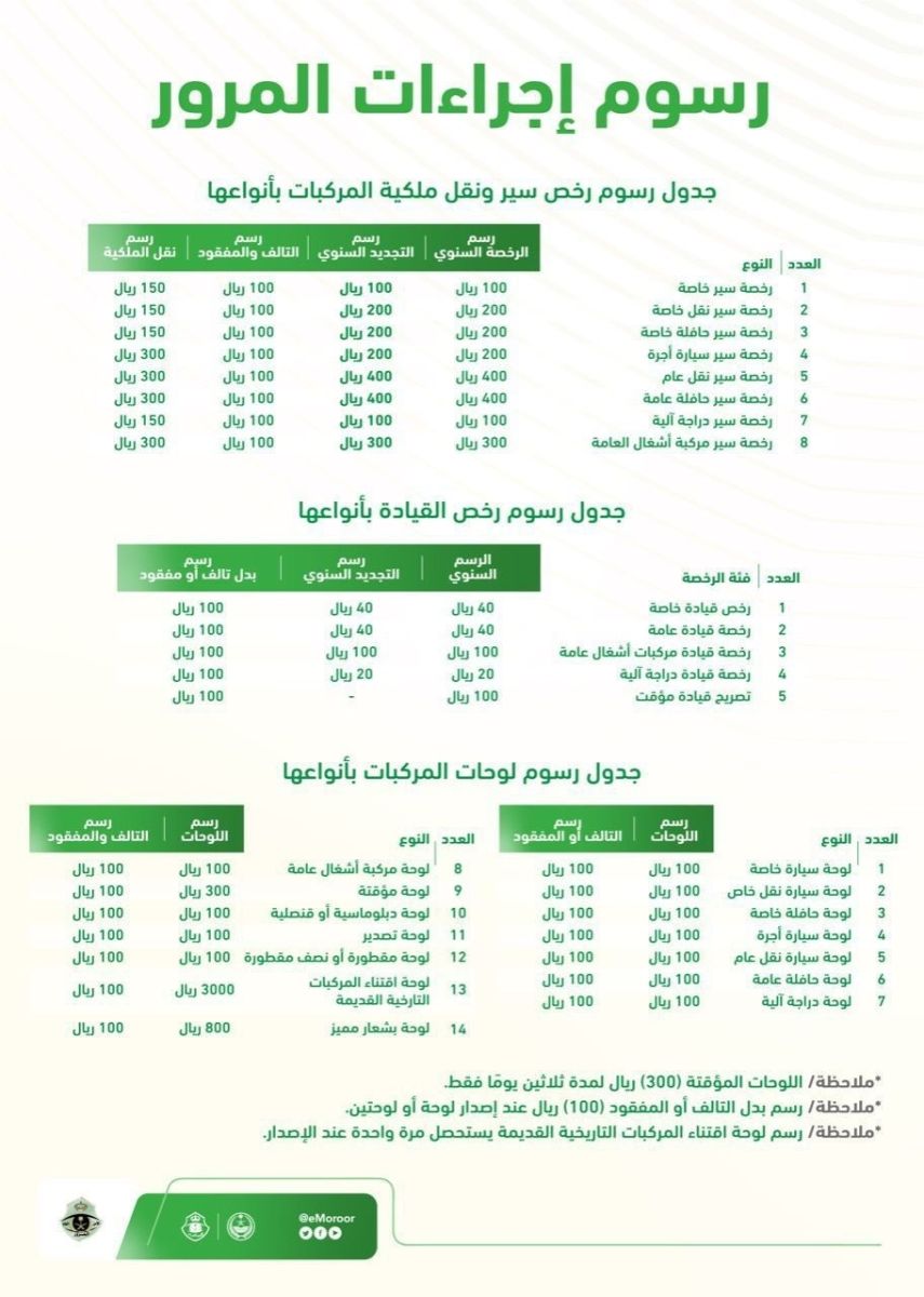 - قيمة رسم الرخصة السنوي ورسم التجديد السنوي ورسم التالف والمفقود 100 ريال.