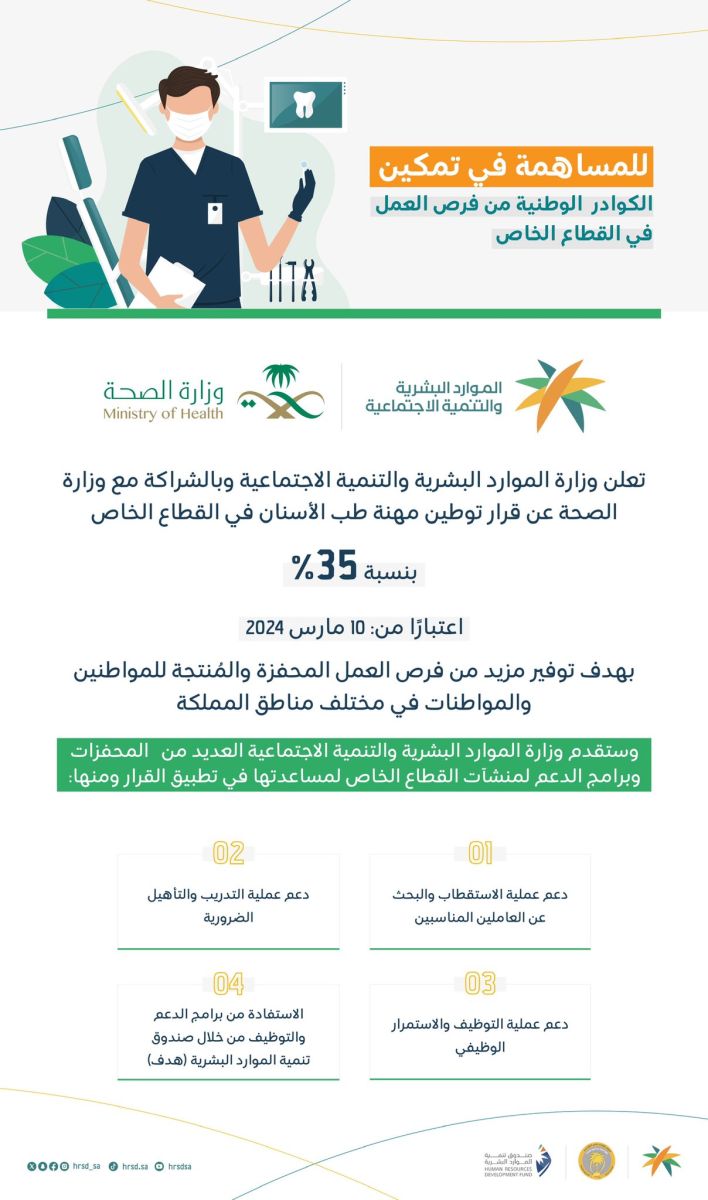أعلنت وزارة الموارد البشرية والتنمية الاجتماعية بالتعاون مع وزارة الصحة عن قرار توطين مهنة طب الأسنان في القطاع الخاص بنسبة 35%، اعتبار من 1 يناير 2024.