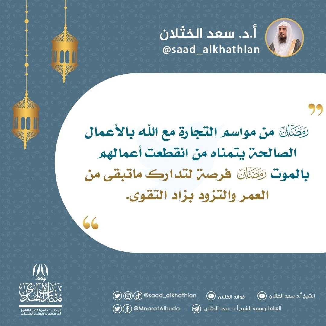 في تصريحاته على موقعه الرسمي، أكد الخثلان أن شهر رمضان يعد فرصة ذهبية للتجارة مع الله من خلال الأعمال الصالحة، يرى في هذا الشهر الكريم فرصة لتدارك ما تبقى من العمر وتعزيز زاد التقوى.