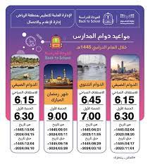 في سياق متصل، ينتهي الدوام الشتوي للعام الدراسي 1445هـ الأحد المقبل 29 شعبان الجاري، وستبدأ الدوام الصيفي بعد إجازة عيد الفطر من 15 أبريل 2024م إلى 22 يونيو 2024م، حيث يتم الاصطفاف الصباحي عند الساعة 6:15 صباحًا، وتكون الحصة الأولى في الساعة 6:30 صباحًا.