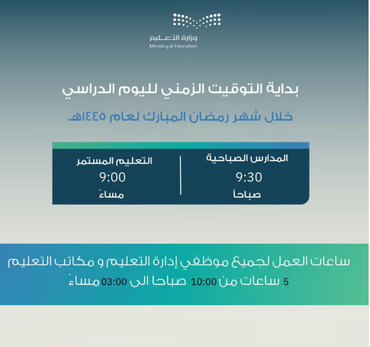 وأوضحت الإدارة أيضاً أن ساعات العمل لجميع موظفي الإدارة ومكاتب التعليم ستكون خلال هذا الشهر من الساعة العاشرة صباحاً وحتى الساعة الثالثة مساءً، بمعدل خمس ساعات يومياً.