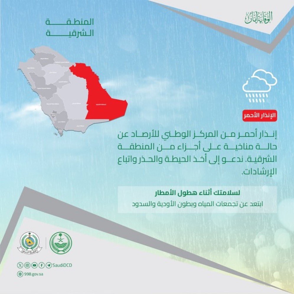 دعت المديرية العامة للدفاع المدني إلى توخي الحذر والامتثال للإرشادات نتيجة للحالة المناخية التي تشهدها بعض مناطق المنطقة الشرقية.
