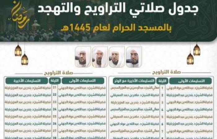 جدول صلاتي التراويح والتهجد بالمسجد الحرام لهذا العام الهجري 1445