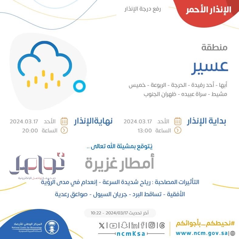 اليوم الأحد، أصدر المركز الوطني للأرصاد بيان تحذيري بشأن توقعات بحدوث أمطار غزيرة مسببة للسيول، بالإضافة إلى هبوب رياح قوية تثير الأتربة والغبار في مختلف مناطق المملكة.