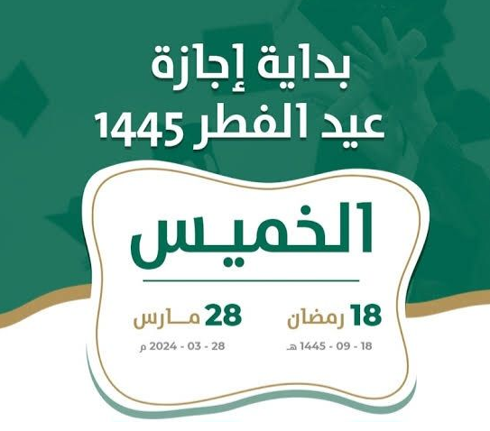 - إجازة القطاع العام تبدأ من يوم الخميس 25 رمضان 1445هـ وتنتهي بنهاية يوم الأحد 5 شوال 1445هـ.