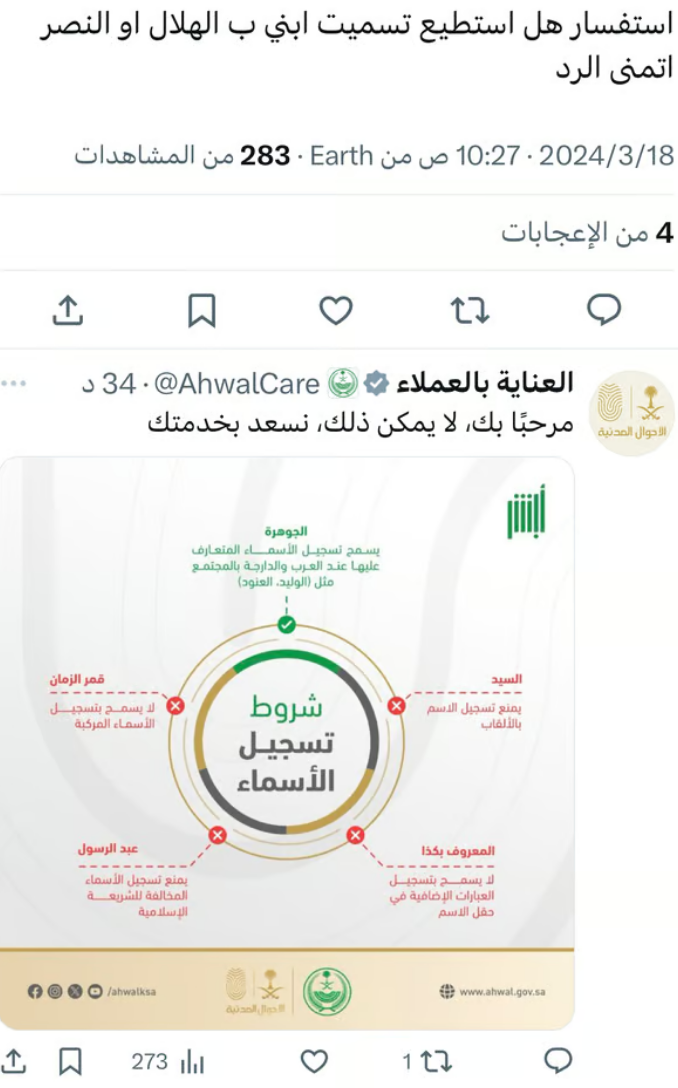 حسب الأحوال المدنية تم تأكيد أنه لا يُسمح بتسمية الأبناء بأسماء مثل "الهلال" و "النصر". هذا التصريح جاء بناءً على الاستفسارات التي وردت إليهم من قبل العملاء على منصة "إكس".