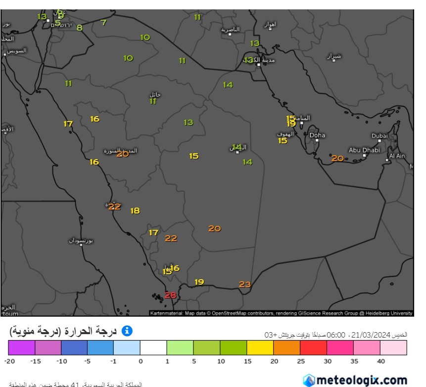 المركز الوطني للأرصاد توقع هطول أمطار رعدية خفيفة إلى متوسطة، مصحوبة بزخات من البرد ورياح نشطة تثير الأتربة والغبار على بعض المناطق، مثل حائل، الجوف، الحدود الشمالية، الأجزاء الشمالية من الشرقية، جازان، ونجران، الأمطار الغزيرة قد تؤدي إلى جريان السيول في أجزاء من عسير، الباحة، مكة، المدينة، القصيم، والرياض، مع احتمالية تشكل الضباب في بعض المناطق.