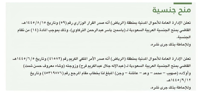 في السياق ذاته، تم إعطاء الجنسية السعودية إلى "عبدالإله جلال عبدالكريم فرح" وزوجته "وشاء معروف حسن شمت" وإلى أبنائهم "صهيب، محمد، وعد، عائشة، وجن"، وهم يقيمون أيضاً في منطقة الرياض.