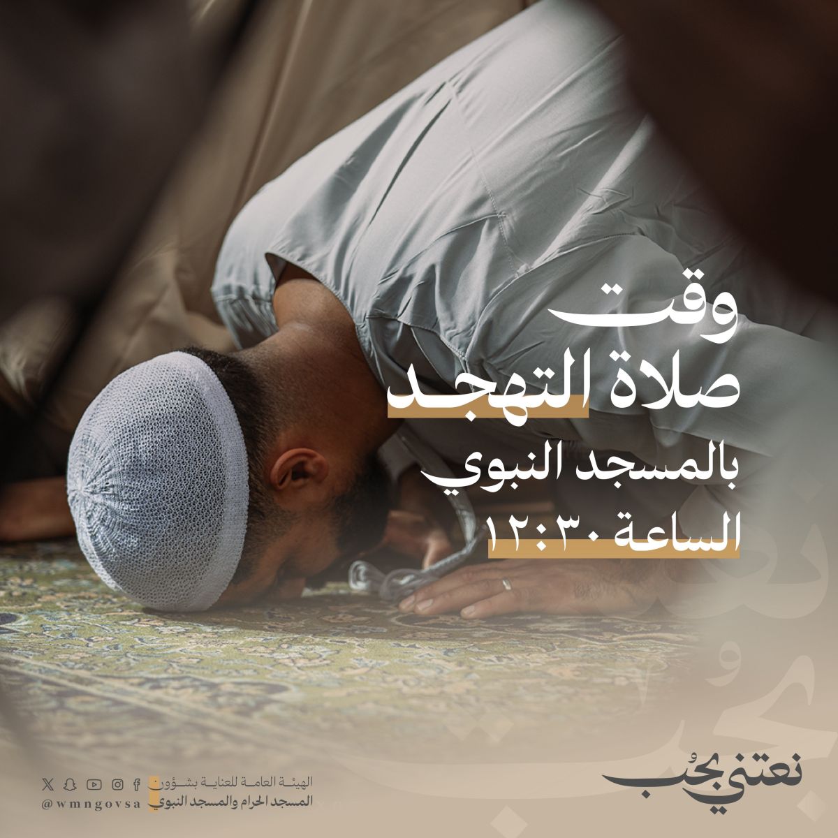 بالموازاة مع ذلك، كشفت الهيئة المعنية بإدارة شؤون المسجد النبوي عن إقامة صلاة التهجد بالمسجد النبوي في نفس التوقيت المحدد بالحرم المكي، الساعة 12:30 صباحاً.