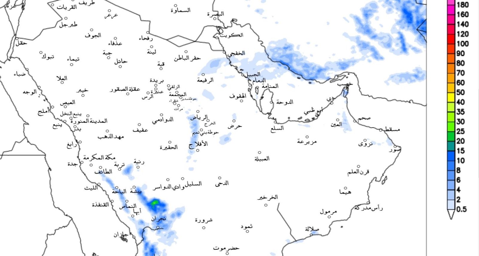 كما ترجح التنبؤات سقوط أمطار متوسطة إلى خفيفة على أنحاء متفرقة من الرياض ومرتفعات مكة المكرمة، وقد يتكون الضباب في ساعات الليل المتأخرة والصباح الباكر على المرتفعات الجنوبية الغربية للمملكة.