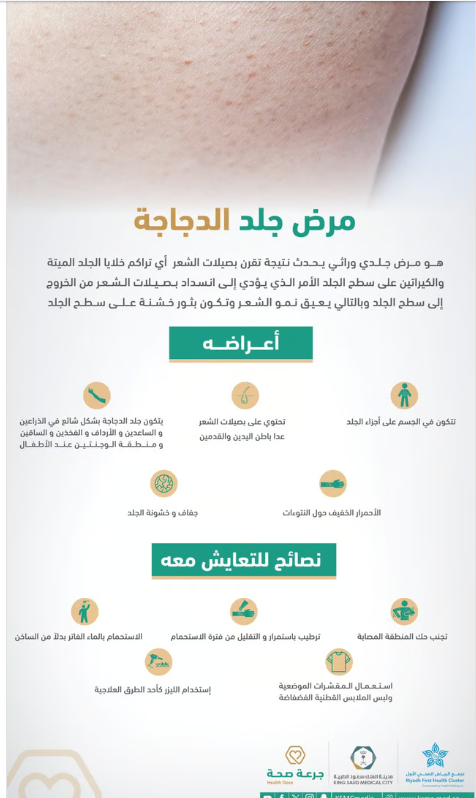 في التفصيل، أوضحت المدينة الطبية أن مرض جلد الدجاجة يعرف طبيا بأنه حالة جلدية تنجم عن تقرن بصيلات الشعر.