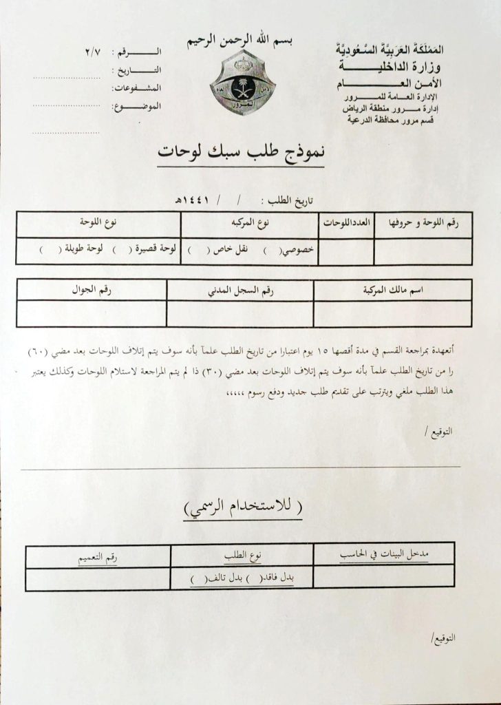 - استكمال النموذج المخصص للتجديد: يجب على صاحب المركبة تعبئة النموذج المعتمد لتجديد لوحة السيارة.