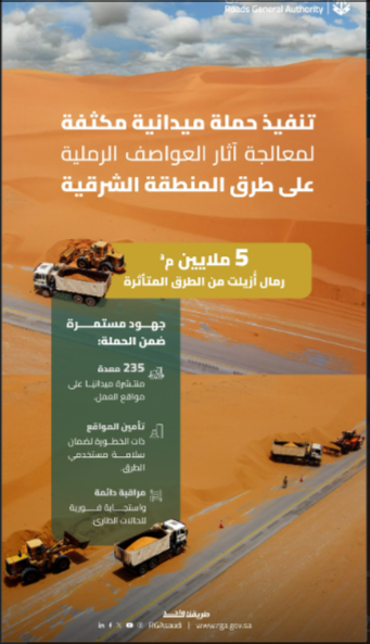كشفت الهيئة عن نتائج ملموسة لحملاتها الميدانية، حيث نجحت فرق العمل التابعة لها في إزالة أكثر من خمسة ملايين متر مكعب من الرمال المتراكمة على امتداد شبكة الطرق في المنطقة الشرقية.
