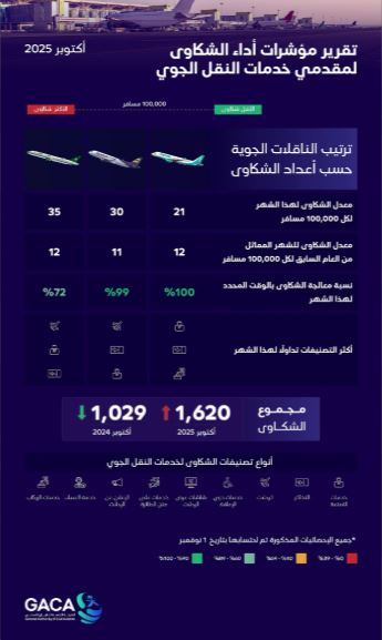 في وقت أصبحت فيه تجربة المسافر معيار رئيسي لتقييم مستوى الخدمات داخل المملكة، كشفت الهيئة العامة للطيران المدني عن تقريرها الشهري الخاص بشهر أكتوبر، وهو التقرير الذي بات يشكل مرجع مهم لكل من يرغب في التعرف على أداء شركات الطيران والمطارات، سواء من ناحية التزامها بالخدمة أو من خلال القدرة على معالجة المشكلات التي يواجهها المسافرون.