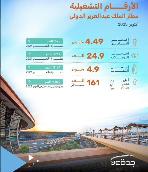 يعكس الأداء المتميز لمطار الملك عبد العزيز الدولي خلال أكتوبر 2025 النجاح المستمر في تحسين تجربة المسافرين، وتوفير بيئة آمنة وسلسة لسفرهم.