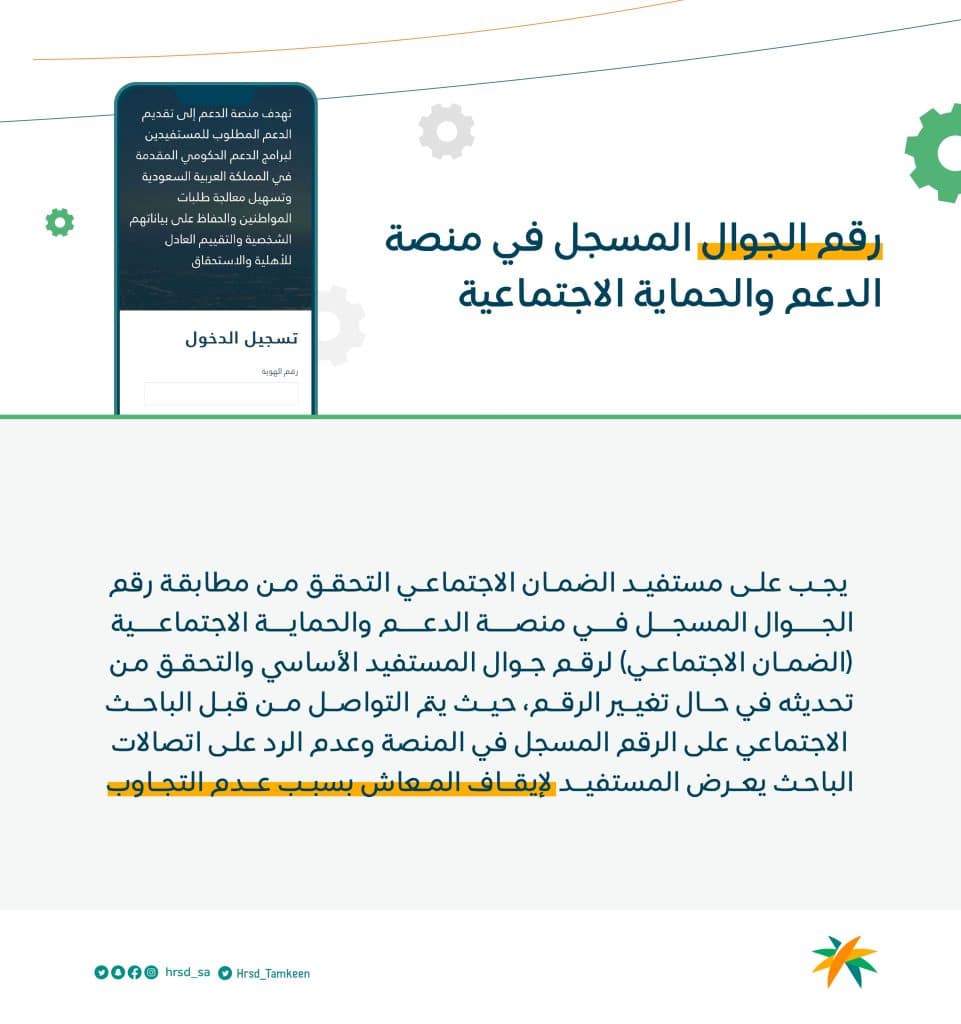 وتؤكد الوزارة أن عدم التجاوب مع الباحث الميداني يعد مؤشر على عدم رغبة المستفيد في الاستمرار بالحصول على الدعم، ما يؤدي مباشرة إلى إيقاف صرف المخصصات.