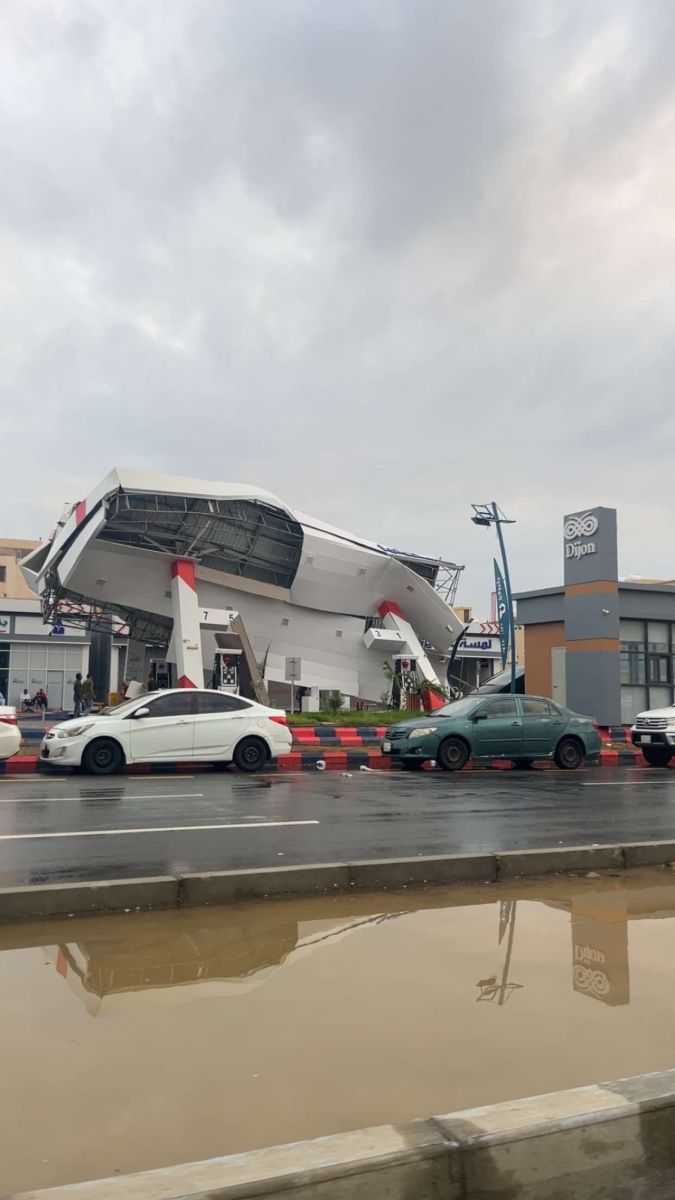 ويرجح أن تجمع المياه وشدة الرياح المصاحبة للأمطار ساهما في سقوط سقف محطة الوقود، خاصة مع تزايد الأحمال الناتجة عن الظروف الجوية غير المستقرة.