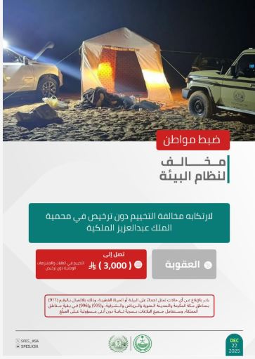 أوضحت الجهات المختصة أن المخالفة وقعت داخل نطاق محمية الملك عبدالعزيز الملكية، حيث قام المواطن بالتخييم في موقع غير مصرح به، مخالف بذلك الأنظمة والتعليمات البيئية المعمول بها.