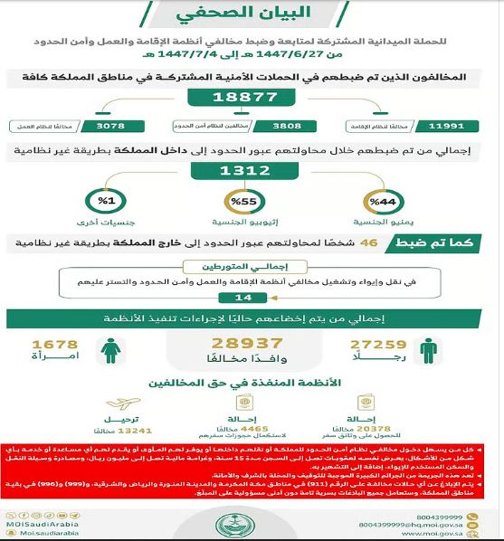 أسفرت الحملات الأمنية عن ضبط عدد كبير من المخالفين لأنظمة الإقامة والعمل وأمن الحدود في مختلف مناطق المملكة. حيث بلغ إجمالي من تم ضبطهم 18877 مخالف، وتوزعت هذه الأعداد على النحو التالي: