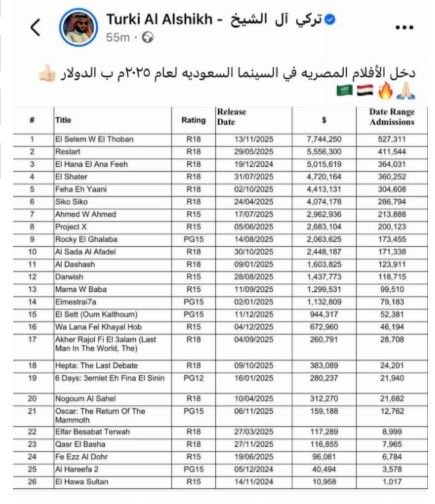 كشف رئيس الهيئة العامة للترفيه المستشار تركي آل الشيخ عن أحدث إحصائية لأكثر عشرين فيلم مصري تحقيق للإيرادات في شباك التذاكر السعودي خلال عام 2025، وأظهرت الأرقام أن إجمالي الإيرادات تجاوز خمسين مليون دولار، وهو رقم غير مسبوق يعكس قوة التفاعل الجماهيري مع هذه الأعمال.
