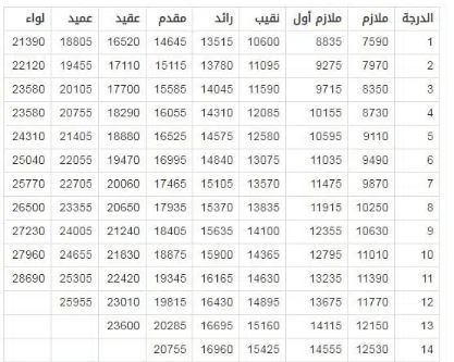 فيما يلي توضيح لرواتب العسكريين الأفراد من رتبة جندي وحتى رئيس رقباء حسب الدرجة: