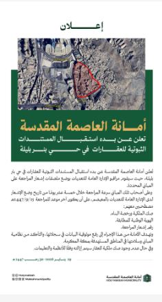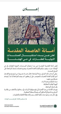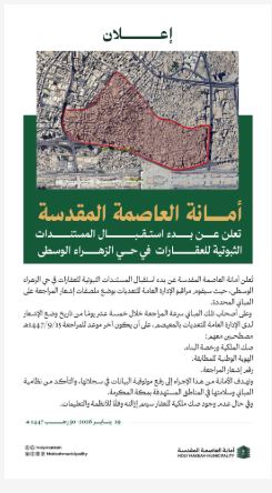 دعت أمانة العاصمة المقدسة جميع الملاك في الأحياء المشمولة إلى سرعة المبادرة بمراجعة الجهات المختصة خلال الفترة المحددة، والتعاون مع الفرق الميدانية، مؤكدة أن الالتزام بهذه الإجراءات يسهم في حفظ الحقوق وتنظيم النسيج العمراني وتحقيق المصلحة العامة للجميع.