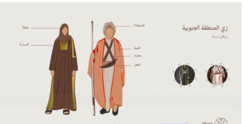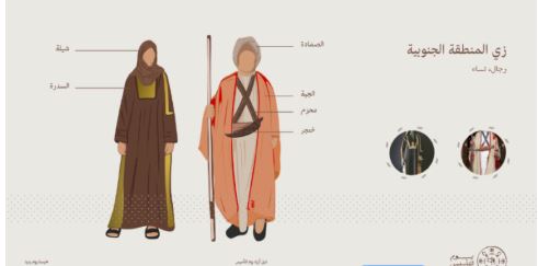 تتميز المنطقة الجنوبية بأزياء تراثية غنية بالألوان والتفاصيل التي تعكس طبيعة الجبال والبيئة الزراعية.