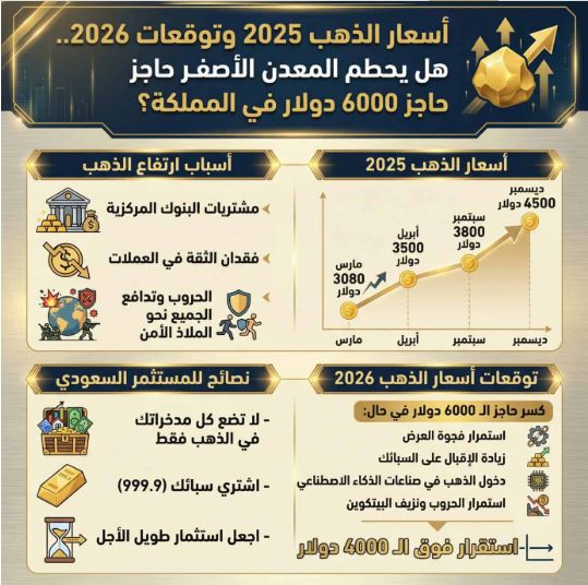 دخل الذهب عام 2026 وهو في مستويات تاريخية مرتفعة. وتشير بعض التقديرات الصادرة عن بنك أوف أمريكا إلى إمكانية وصول الأسعار إلى 6,000 دولار للأونصة بحلول منتصف العام، خاصة إذا استمرت الضغوط على العملات العالمية وزاد الطلب الاستثماري.