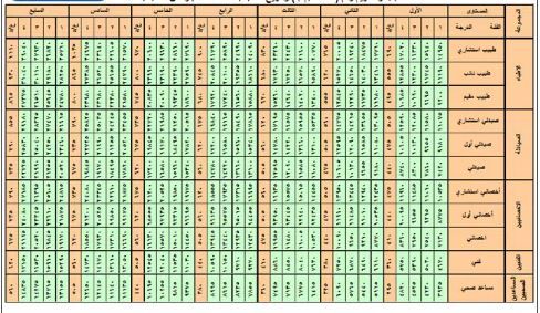 ويظهر هذا السلم الفروقات بين الرواتب وفقا للدرجة الوظيفية (من الدرجة السابعة حتى الأولى)، إلى جانب اختلافها تبعا للخبرة والتخصص، ما يضمن تحقيق العدالة الوظيفية وتحفيز الكوادر الطبية على التطور المهني.